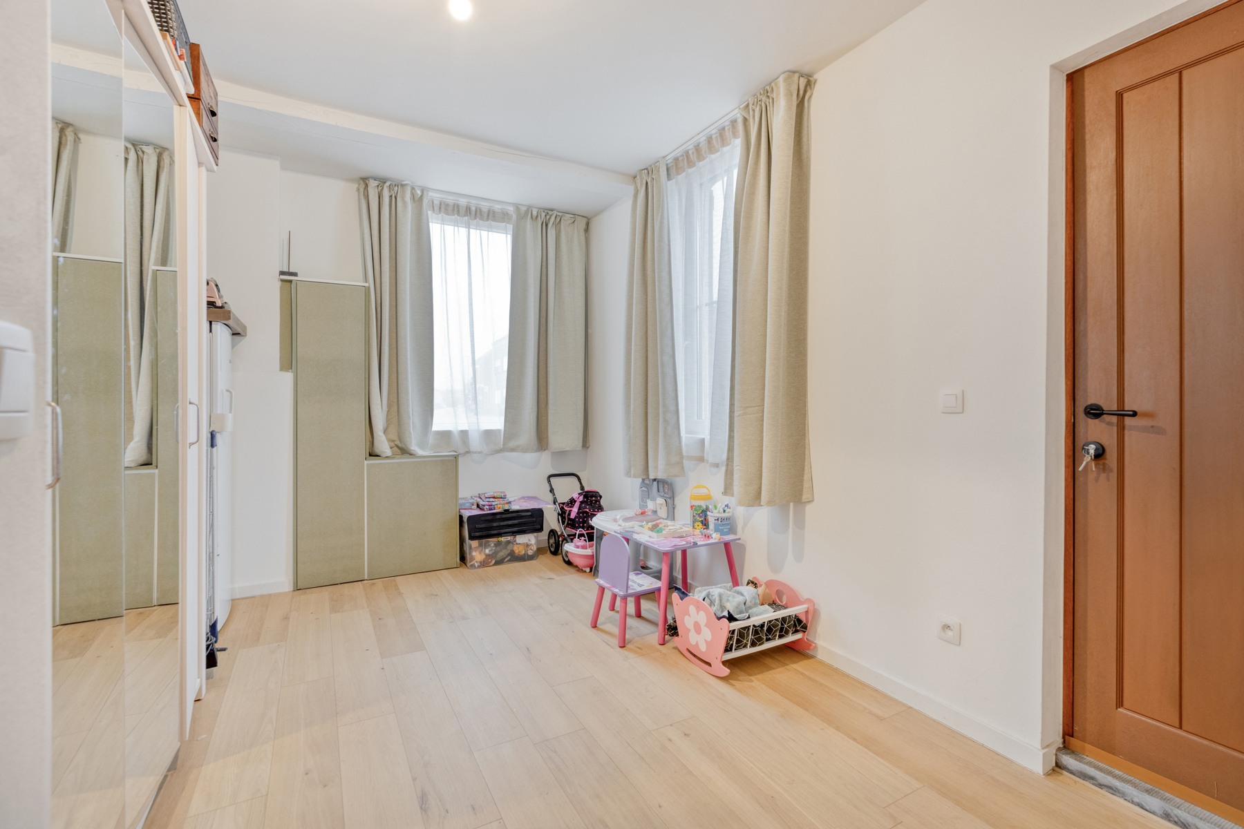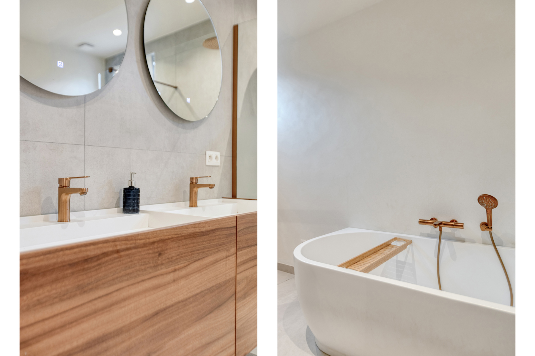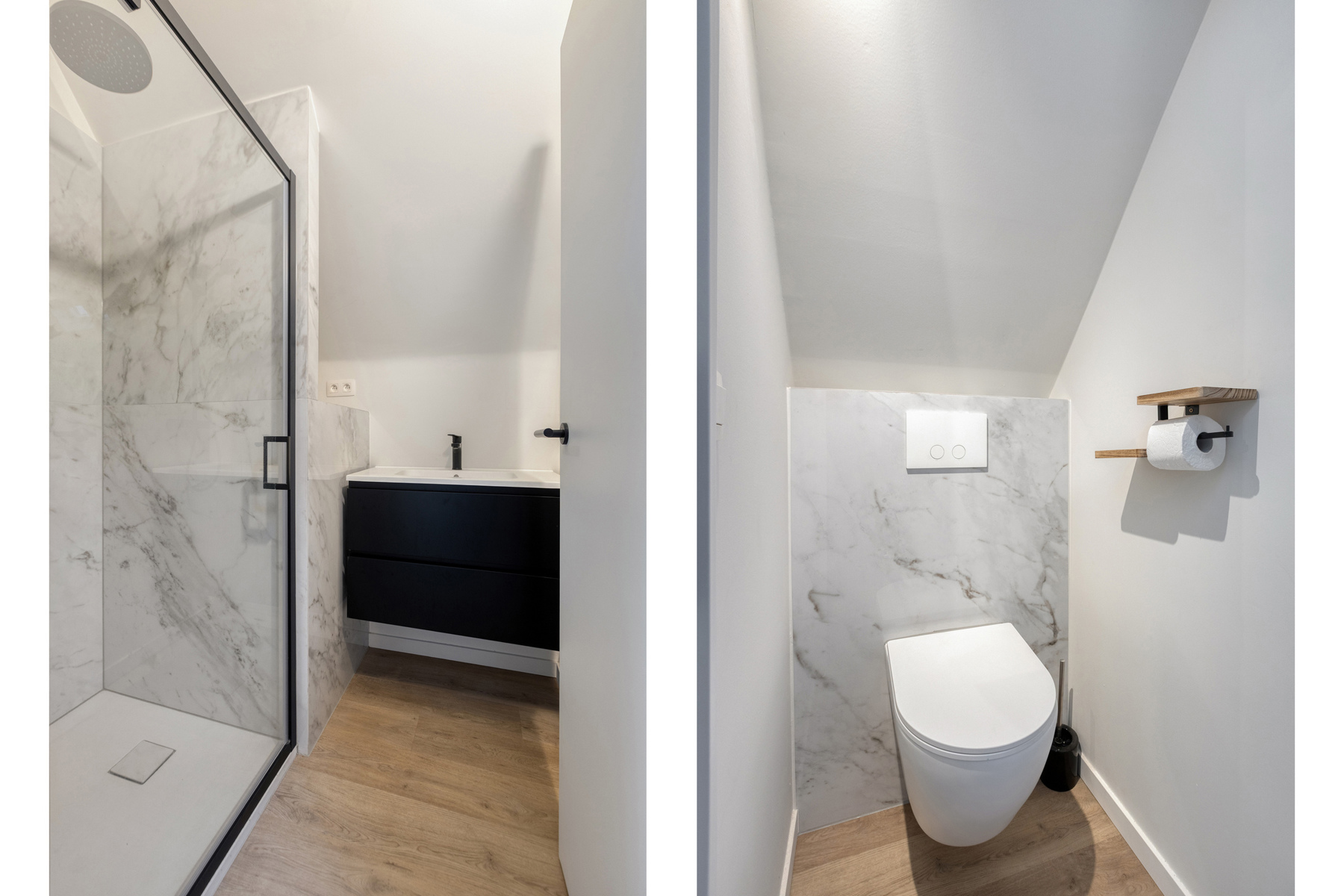 Indeling: Gelijkvloers: woonkamer met hoge plafonds en loftruimte met berging, toegang tot tuin en terras, open keuken met kookeiland (inductiekookplaat met ingebouwde dampafzuiging (Bora), 2 ovens (combi en magnetron/Samsung), een koel- en vrieskast (Samsung) en een vaatwasser (AEG). 2 slaapkamers, waarvan een met aparte ingang – ideaal als kantoorruimte voor uw praktijk of andere activiteit, momenteel gebruikt als inkomhal/dressing. Luxueuze badkamer met vrijstaand ligbad, kranen in koperkleur, inloopdouche, dubbele lavabo, 2 spiegels. Apart toilet met lavabo. Inkomhal met wasplaats achteraan de woning, met toegang tot de tuin, aansluiting voor wasmachine, droogkast en wasbak. 1ste verdieping: Slaapkamers: 3e en 4e slaapkamer, beide met hoge plafonds en karaktervolle houten balken. 2de badkamer met douche en lavabo afgewerkt met gemarmerde tegels. 2de toilet.