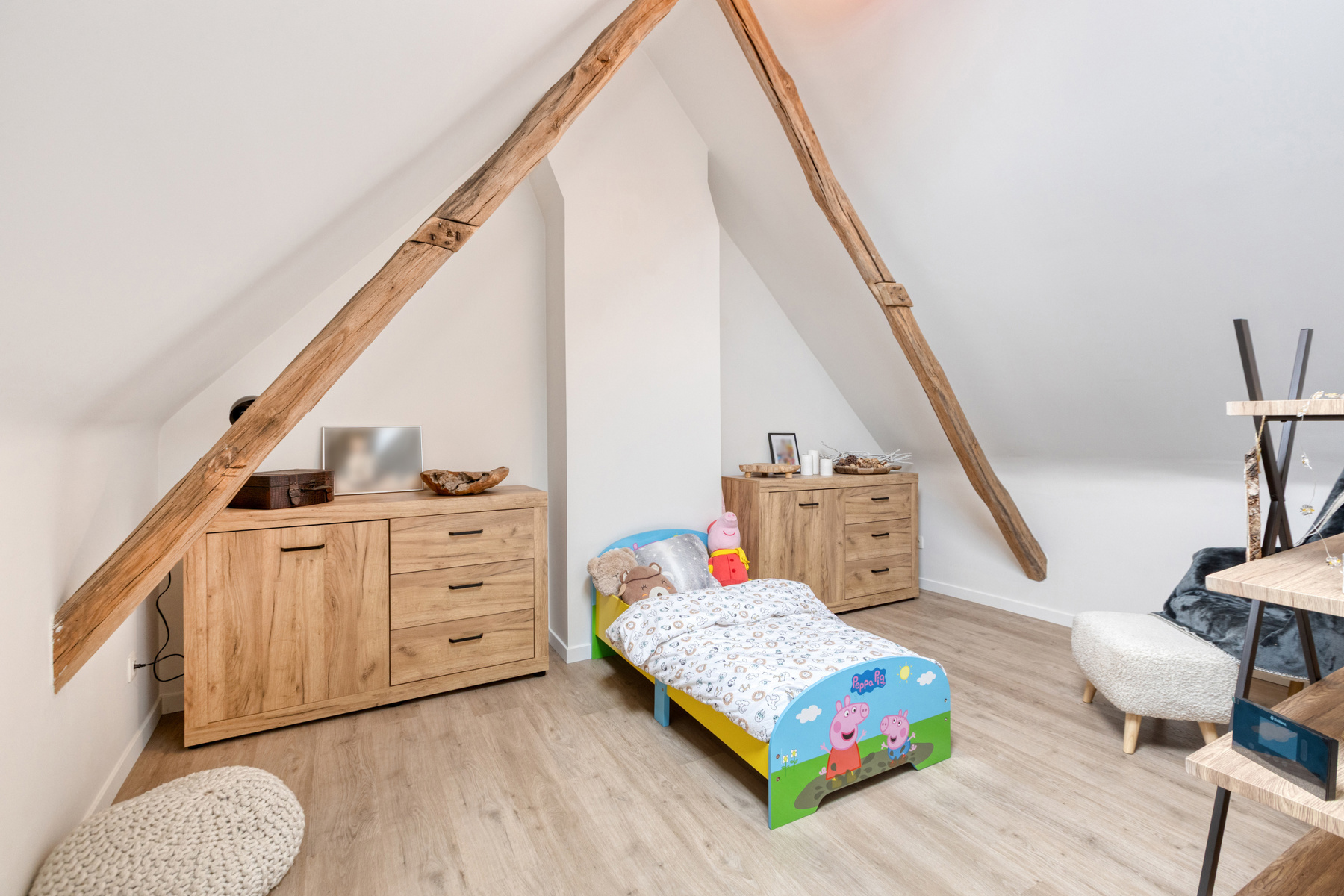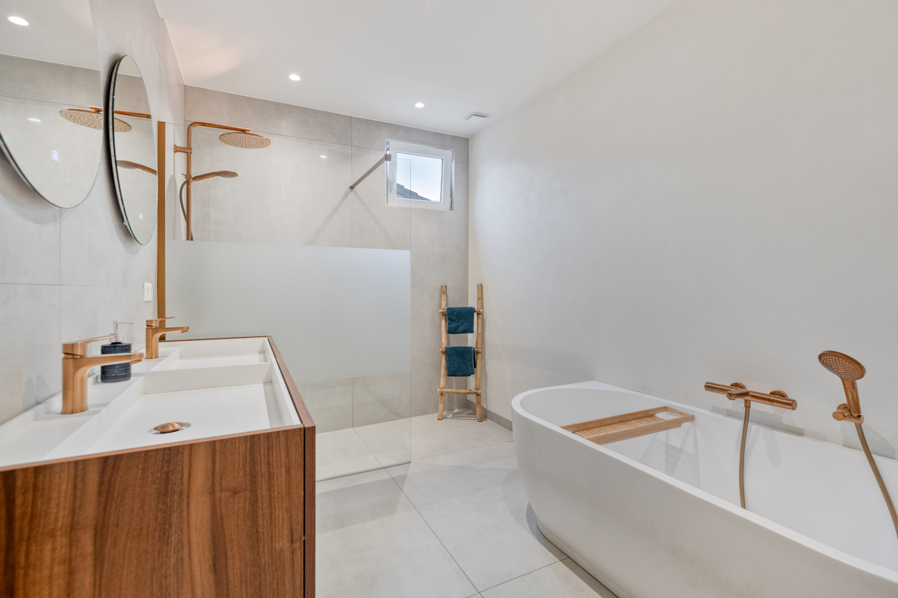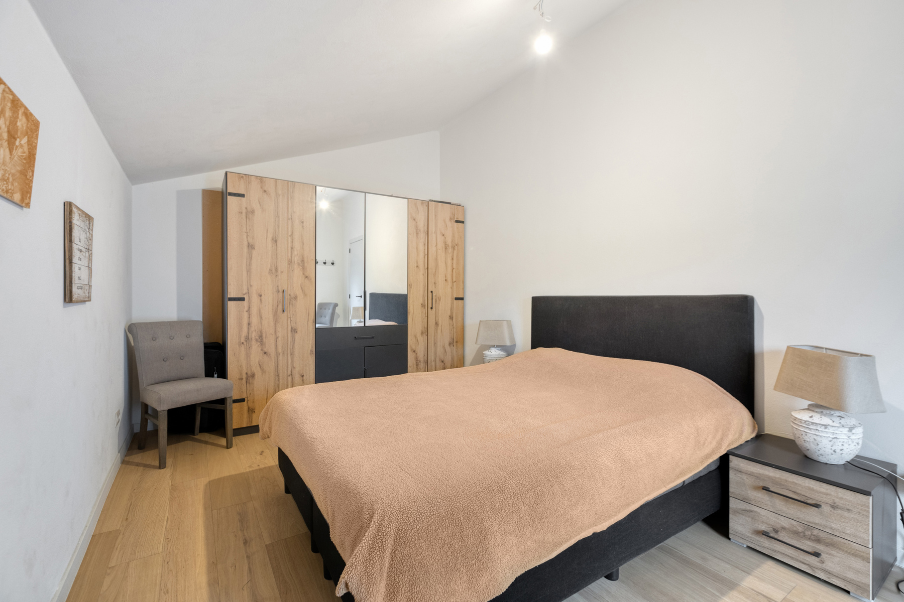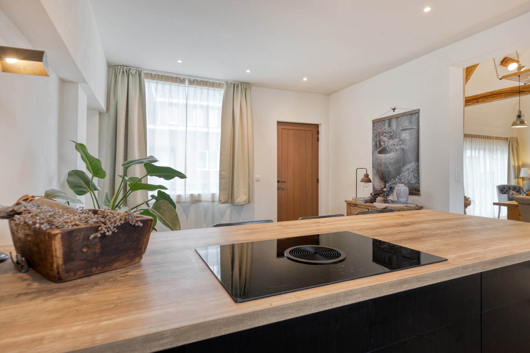 Indeling: Gelijkvloers: woonkamer met hoge plafonds en loftruimte met berging, toegang tot tuin en terras, open keuken met kookeiland (inductiekookplaat met ingebouwde dampafzuiging (Bora), 2 ovens (combi en magnetron/Samsung), een koel- en vrieskast (Samsung) en een vaatwasser (AEG). 2 slaapkamers, waarvan een met aparte ingang – ideaal als kantoorruimte voor uw praktijk of andere activiteit, momenteel gebruikt als inkomhal/dressing. Luxueuze badkamer met vrijstaand ligbad, kranen in koperkleur, inloopdouche, dubbele lavabo, 2 spiegels. Apart toilet met lavabo. Inkomhal met wasplaats achteraan de woning, met toegang tot de tuin, aansluiting voor wasmachine, droogkast en wasbak. 1ste verdieping: Slaapkamers: 3e en 4e slaapkamer, beide met hoge plafonds en karaktervolle houten balken. 2de badkamer met douche en lavabo afgewerkt met gemarmerde tegels. 2de toilet.