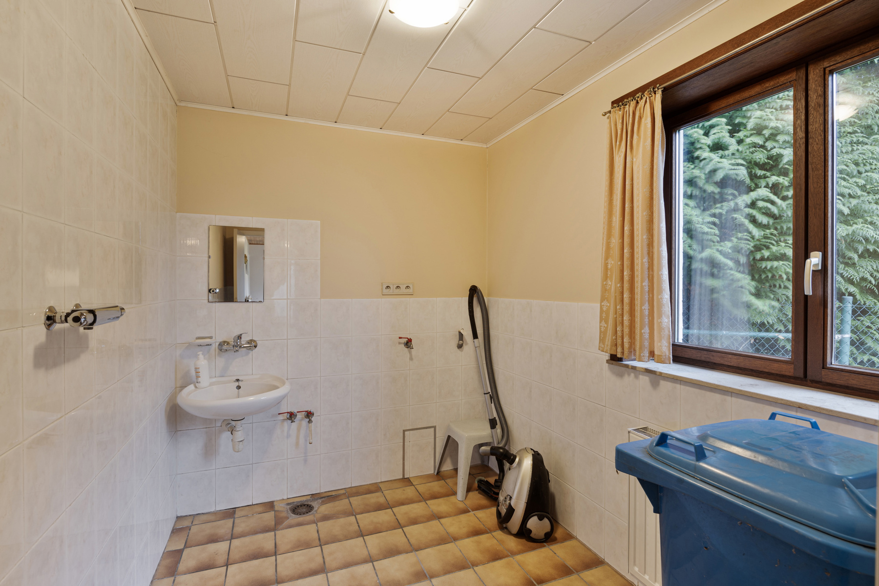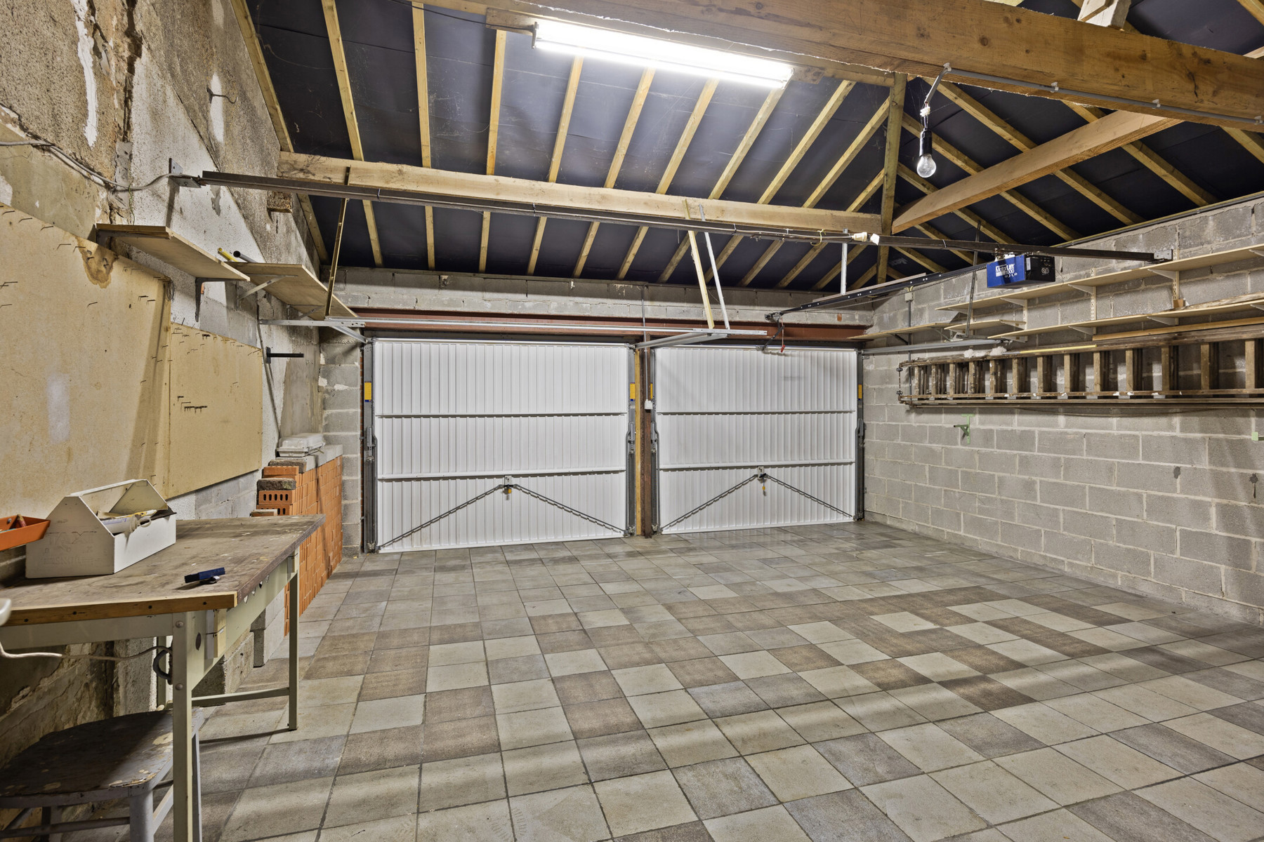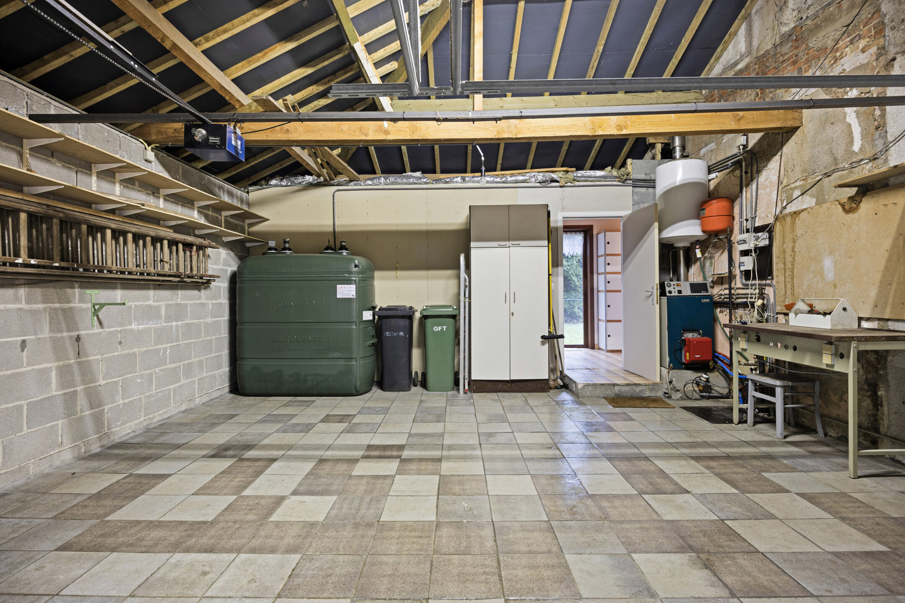 Gelijkvloers: inkomhal, leefruimte (ca. 24m²), slaapkamer of bureau (ca. 11m²), keuken (met recente vaatwasser dd 2018 en gasfornuis), badkamer (dd 2012 met toilet, ligbad en lavabo). De gezellige veranda biedt veel lichtinval en directe toegang tot het terras en de afgesloten tuin (3a 69ca). Aparte wasplaats/berging met lavabo en mogelijkheid tot tweede badkamer. Dubbele garage met technische ruimte +/- 40m2. Eerste verdieping: drie ruime slaapkamers (ca. 33m², 15m² en 13m²) in casco staat, klaar voor renovatie. Kelder: extra bergruimte.