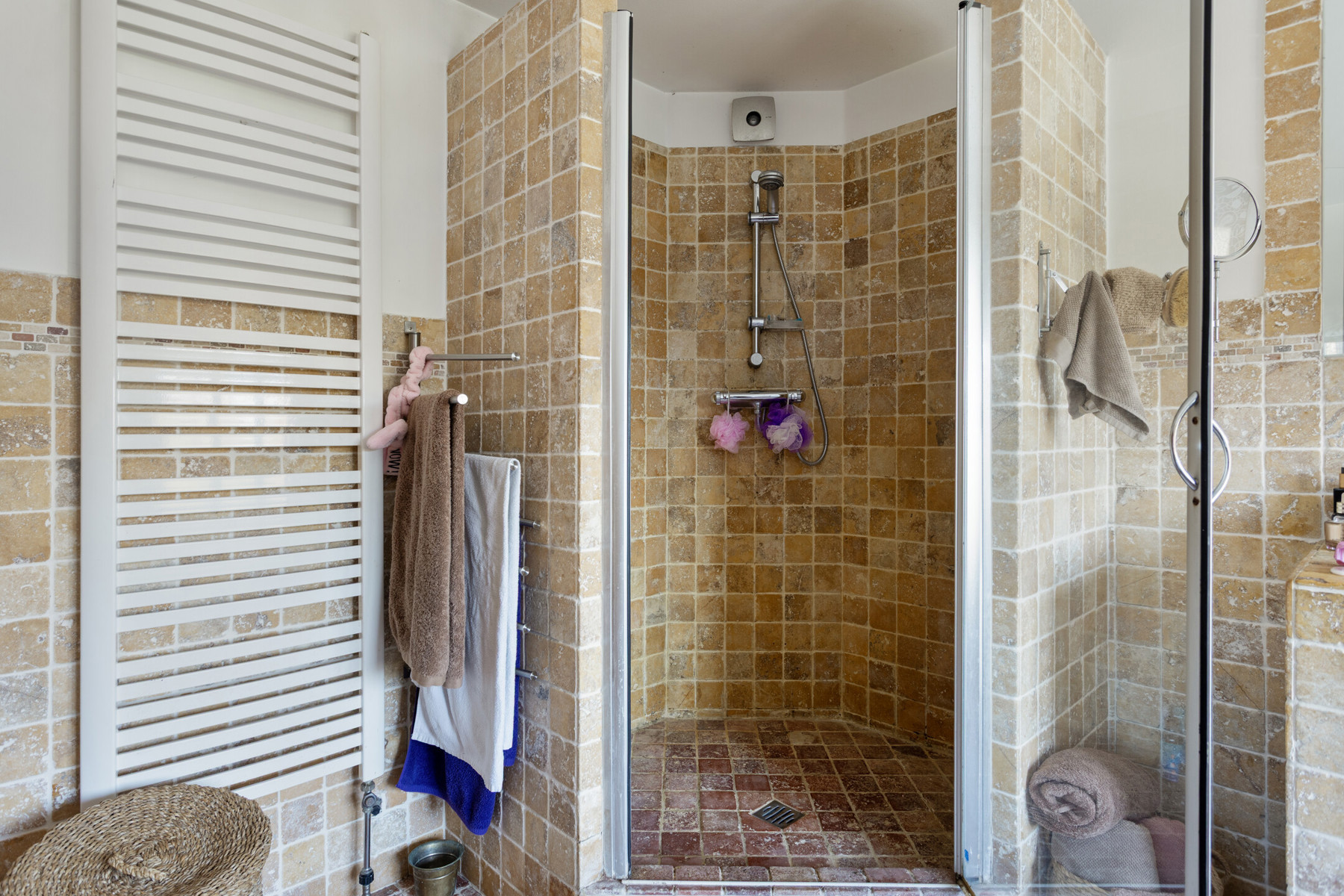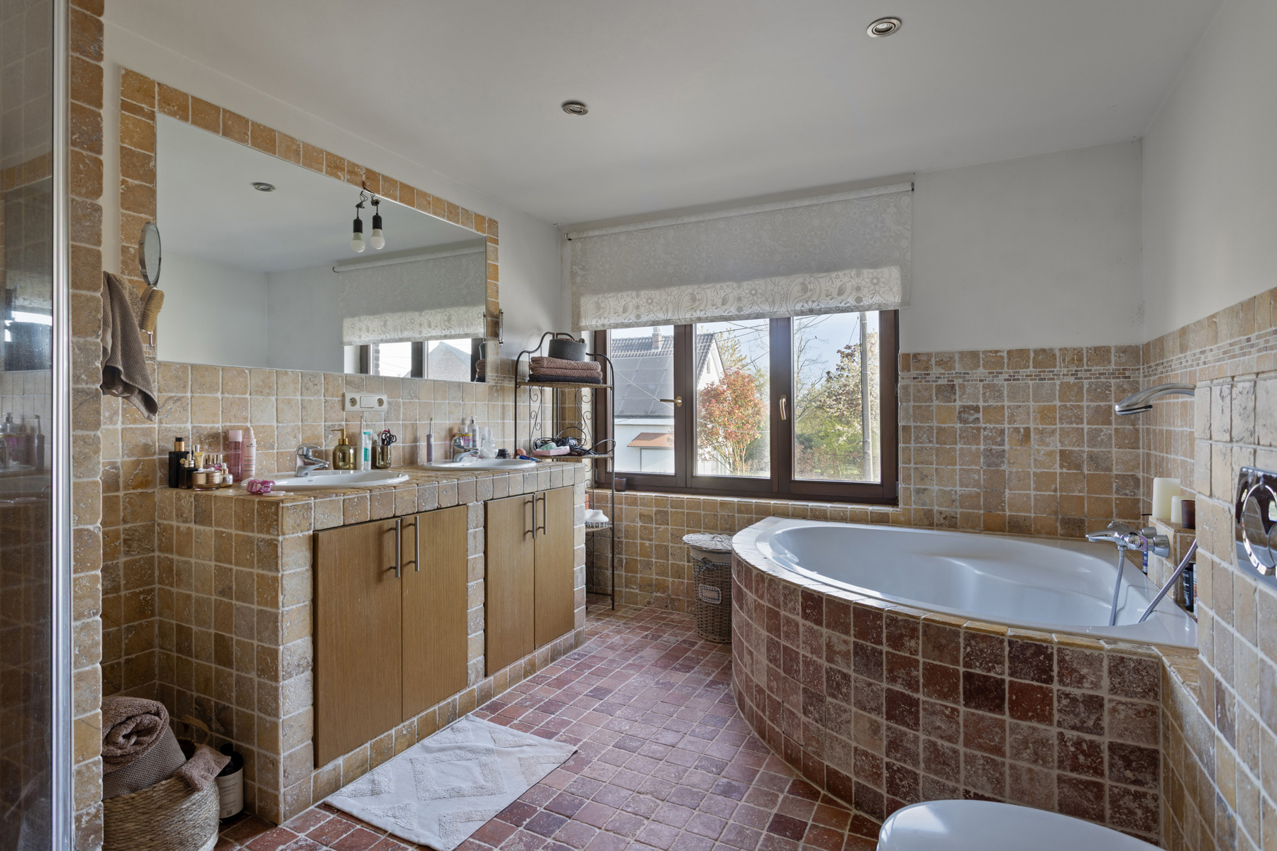 De eerste verdieping telt 3 grote slaapkamers, een 4de kleinere kamer die perfect kan dienen als dressing of bureau (met raam), en een royale badkamer met ligbad, douche en dubbele lavabo, afgewerkt in natuursteen. Kruipkelder.