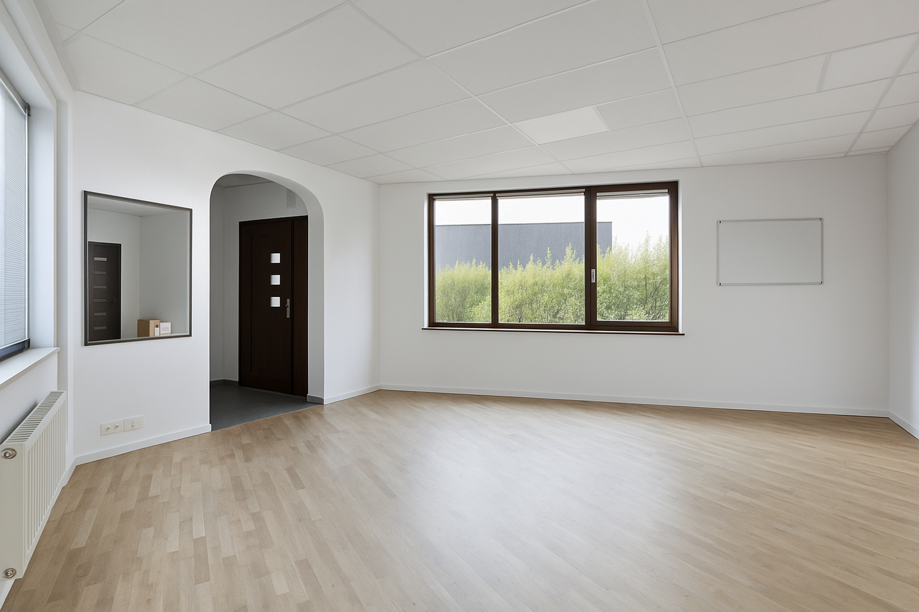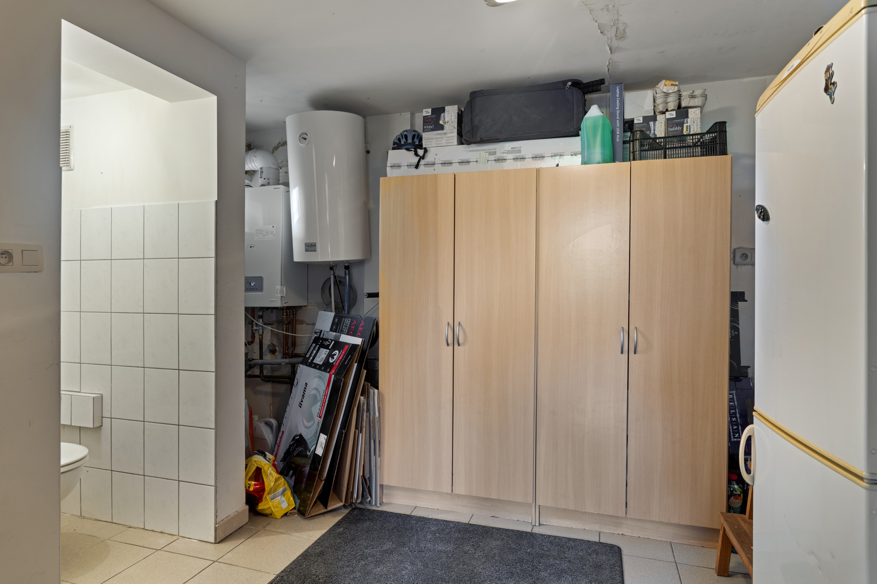 Indeling: Op het gelijkvloers bevindt zich een lichtrijke woonkamer (momenteel ingericht als kantoor), een ruime en volledig uitgeruste keuken met kookeiland en eetplaats, en een technische ruimte/berging met apart toilet.